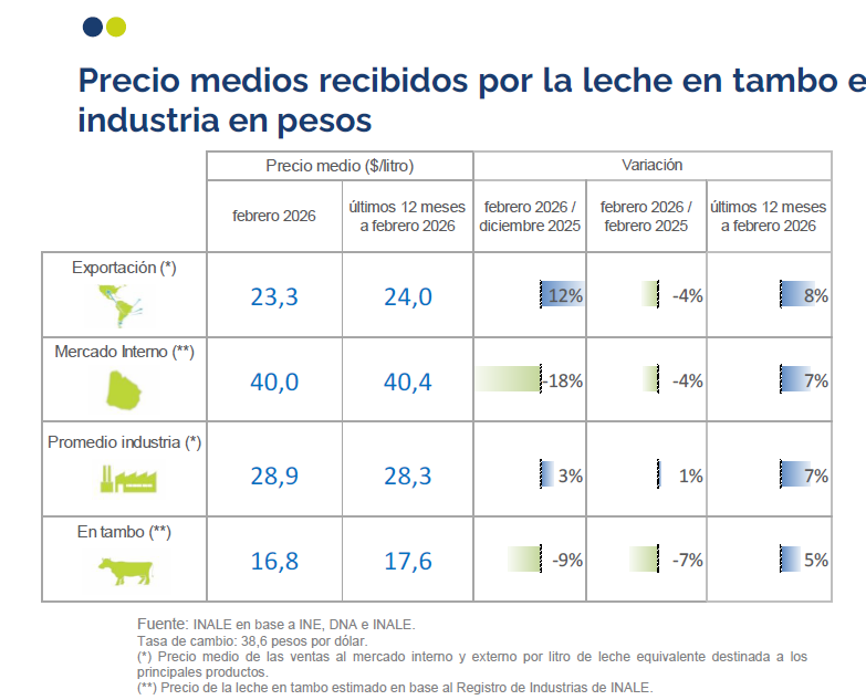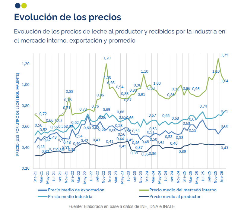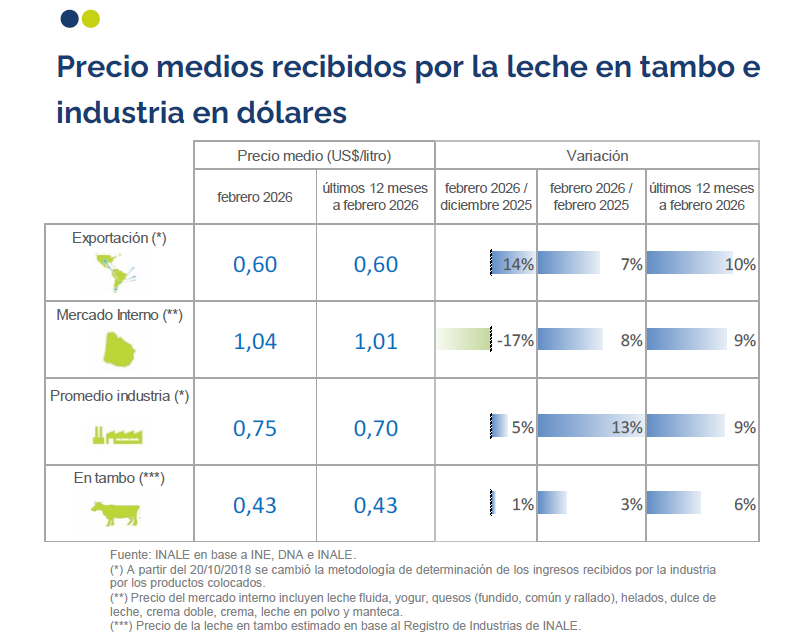 El precio recibido por la industria en dólares de febrero fue 5% mayor al recibido en diciembre del 2025 con aumentos en los precios de exportación