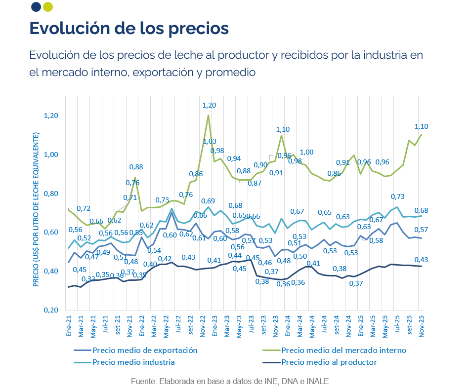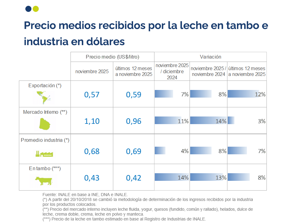 El precio recibido por la industria en dólares de noviembre fue 8% mayor al recibido noviembre del 2024 con aumento en los precios de exportación