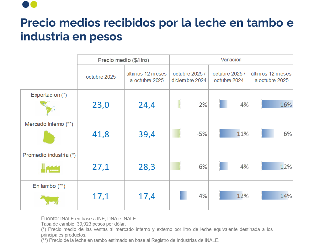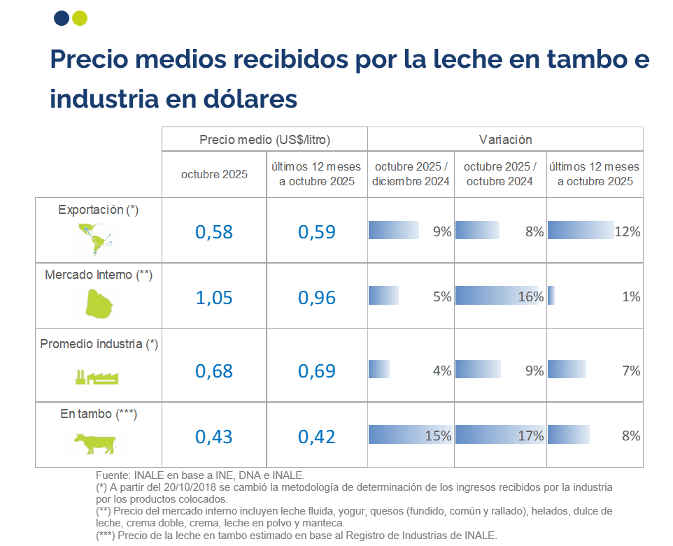 El precio recibido por la industria en dólares de octubre fue 9% mayor al recibido octubre del 2024 con aumento en los precios de exportación