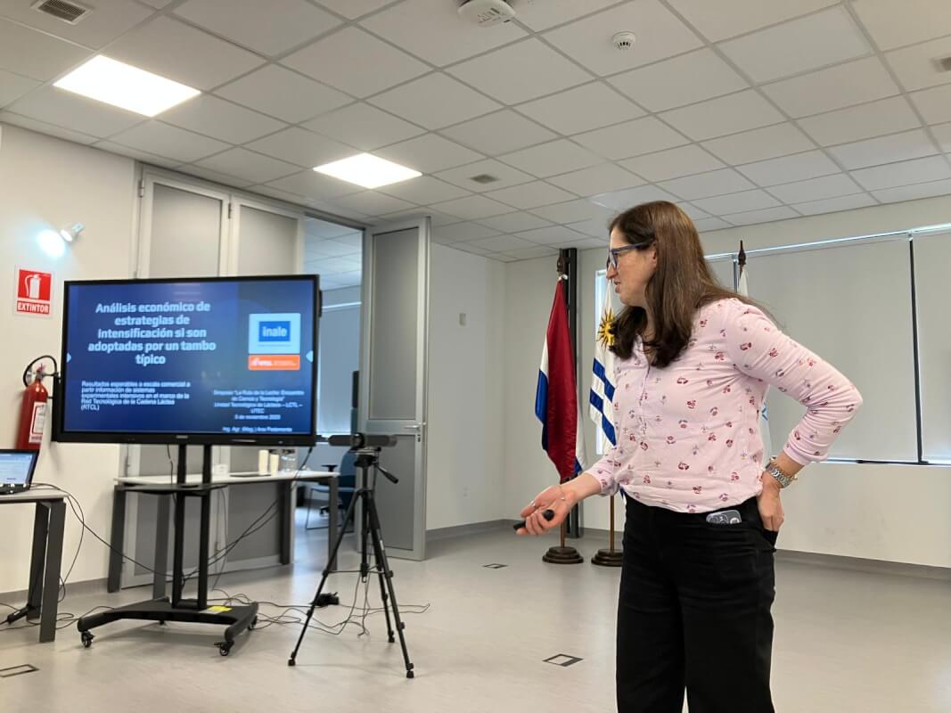 Posteriormente, la Ing. Agr. Ana Pedemonte compartió un análisis económico de las estrategias de intensificación productiva desarrolladas en el marco de la red. Su presentación abordó los resultados potenciales que dichas estrategias tendrían si fueran adoptadas por un tambo típico uruguayo, mostrando su impacto sobre la eficiencia y la rentabilidad de los sistemas.