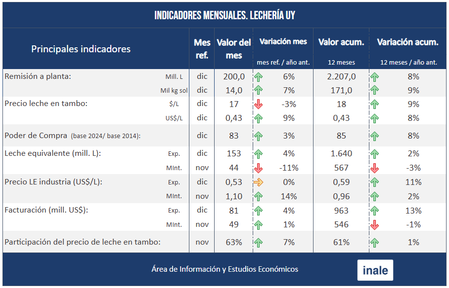 Indicadores Mensuales Lechería UY enero 2026