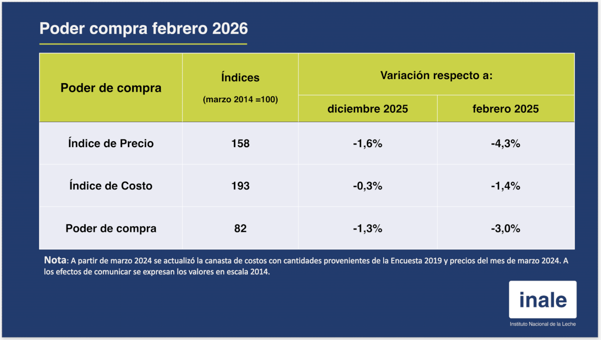 Poder de Compra de febrero de 2026 empeoró 3,0% respecto al mismo mes de 2025, dado por un descenso de 4,3% en el índice de precio de la leche acompañado por el descenso menor del índice de costo de la leche de 1,4%.