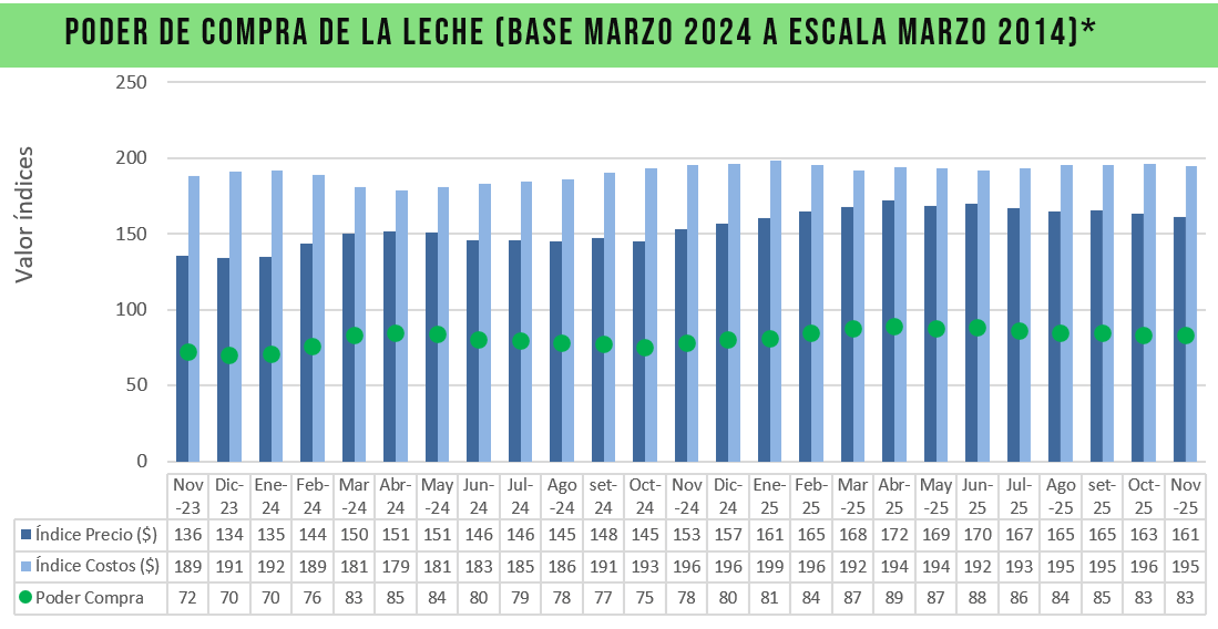 Poder de Compra de noviembre 2025 mejoró 5,8% respecto al mismo mes de 2024 dado por un aumento del 5,5% en el índice de precio de la leche acompañado por el mantenimiento del índice de costo de la leche. Si se compara con el mes anterior el poder de compra decreció (-0,5%) como consecuencia del caída del índice de precio de la leche (-1,1%) con un índice de costos que apenas descendió (-0,6%).