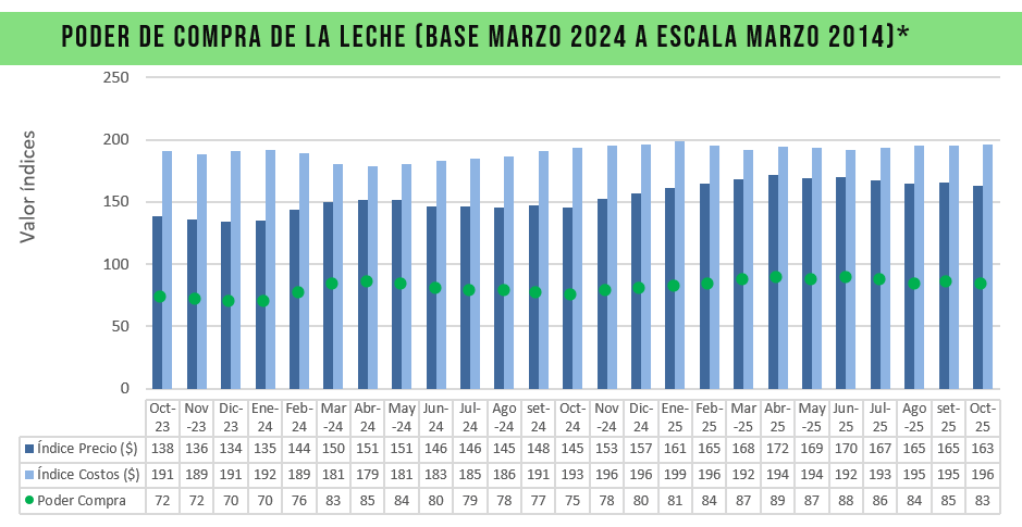 Poder de Compra de octubre 2025 mejoró 10,6% respecto al mismo mes de 2024 dado por un aumento del 15,0% en el índice de precio de la leche acompañado por el incremento de 1,6% del índice de costo de la leche. Si se compara con el mes anterior el poder de compra decreció (-1,9%) como consecuencia del caída del índice de precio de la leche (-1,3%) con un índice de costos que apenas aumentó (0,6%).