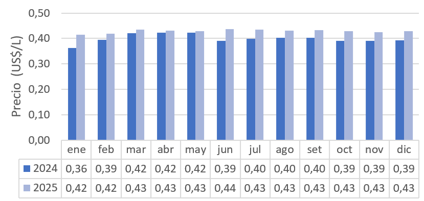 En diciembre el precio descendió en pesos y por kilo de sólidos (-3%) y mejoró en dólares (+9%) comparado con el mismo mes de 2024.