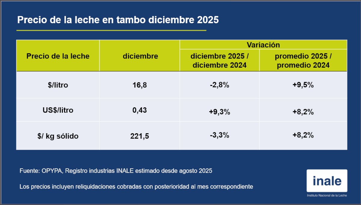 Precio de la leche en tambo: diciembre de 2025 fue 16,8 pesos y 0,43 dólares