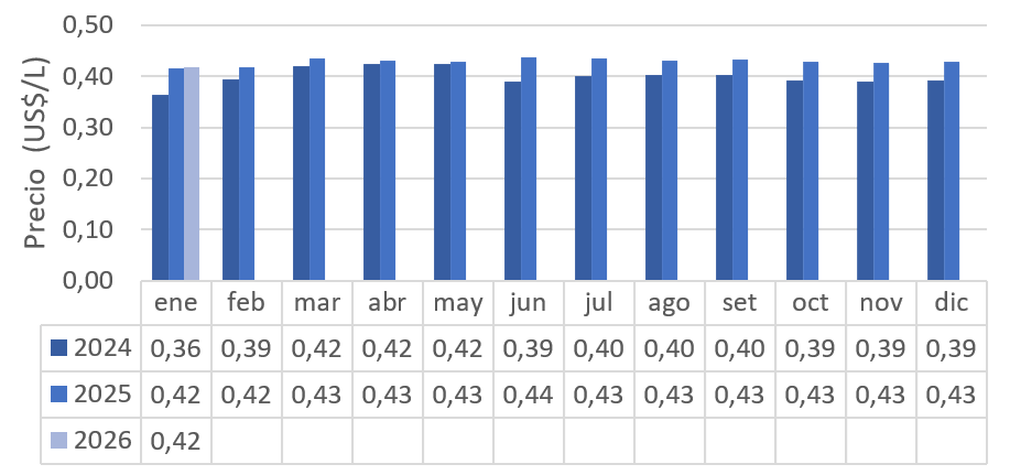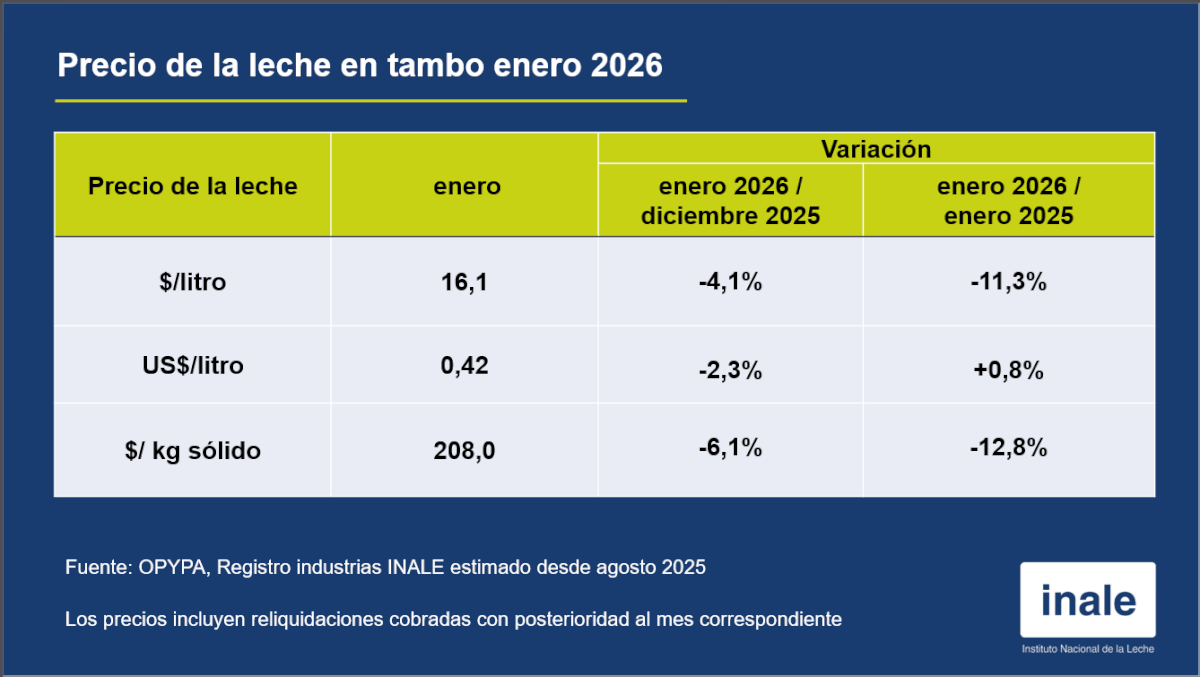 En enero el precio descendió en pesos y por kilo de sólidos (-11% y -13% respectivamente) y prácticamente se mantuvo en dólares (+9%) comparado con el mismo mes de 2025.