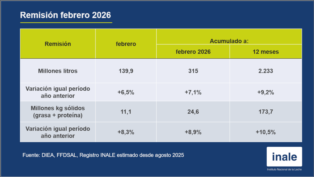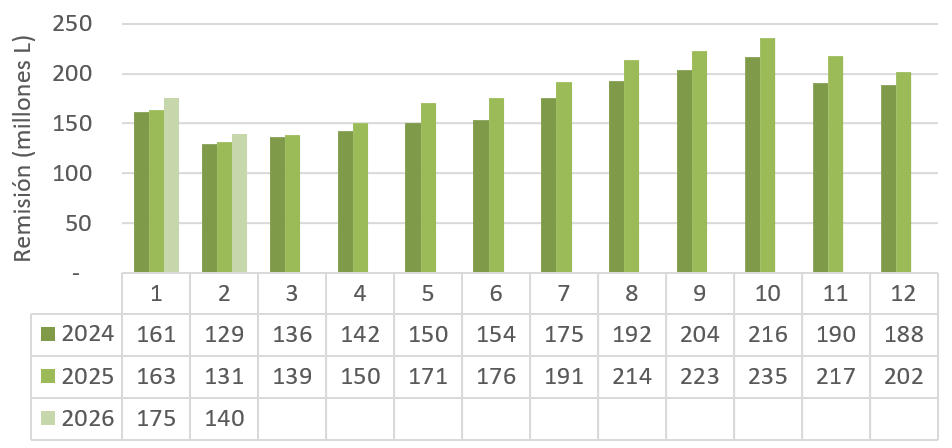 Remisión: febrero 2026 de 140 millones de litros (6,5% más que febrero 2025)