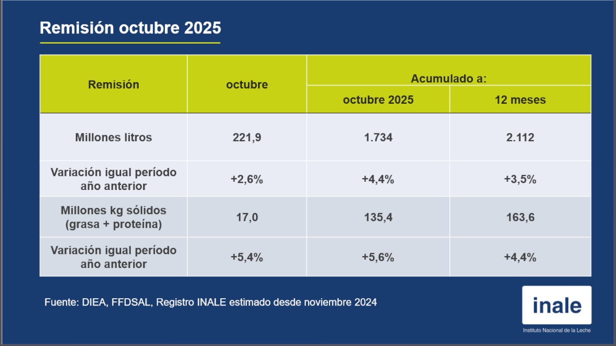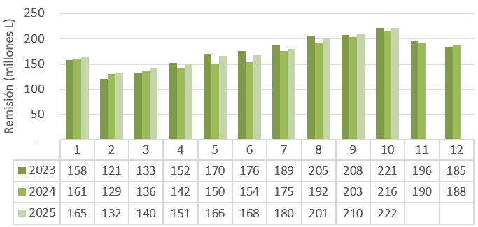 Remisión: octubre 2025 de 222 millones de litros (3% más que octubre 2024)