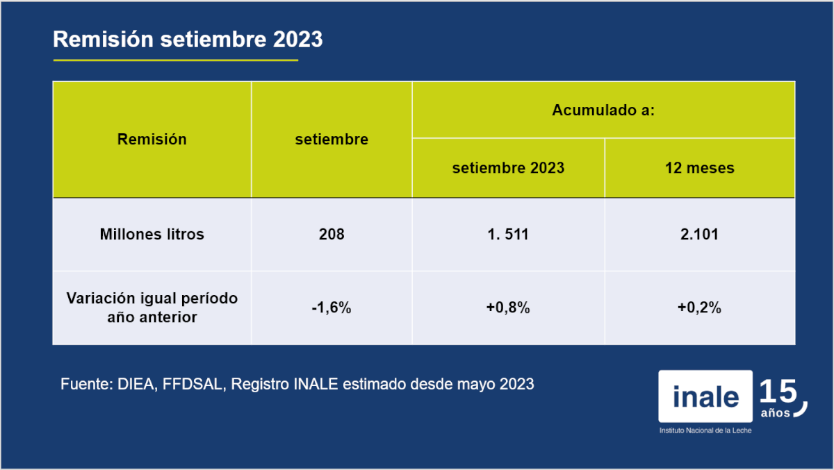 Remisión: setiembre 2023 208 millones de litros (2% menor que setiembre 2022), acumulado 12 meses 2.101 millones similar al de 2022